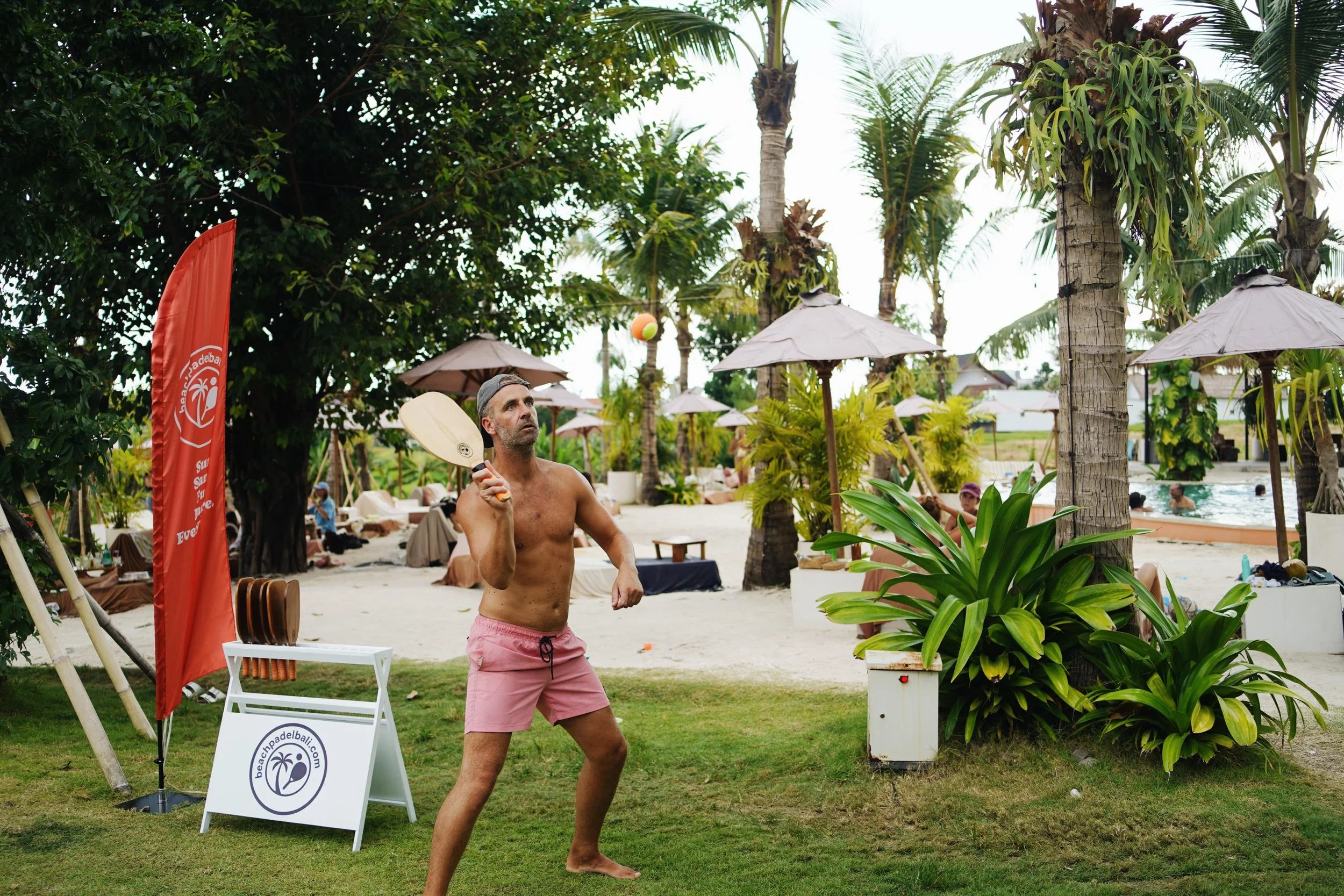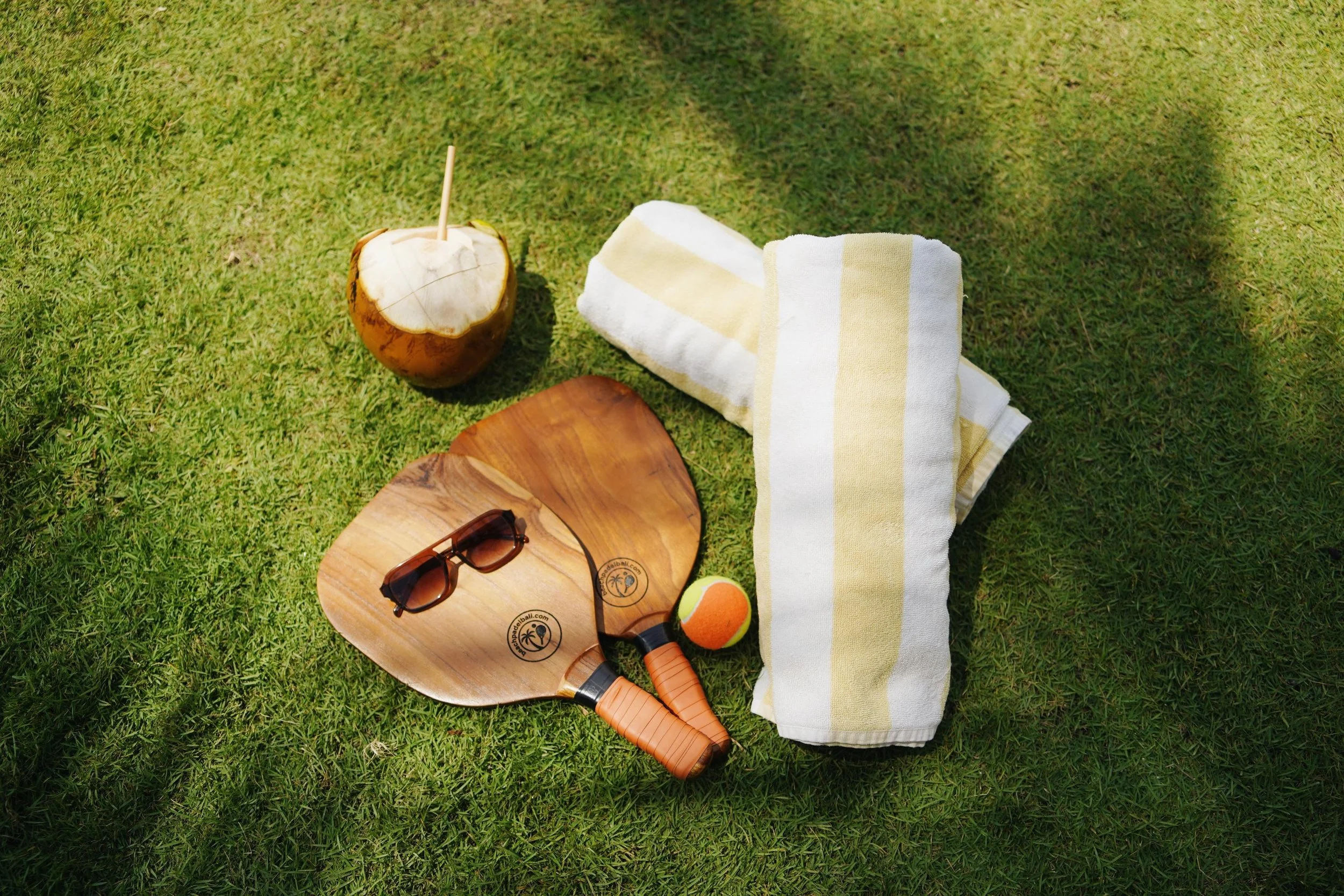 Beachside or lawn padel rallies at golden hour — perfect for guest
