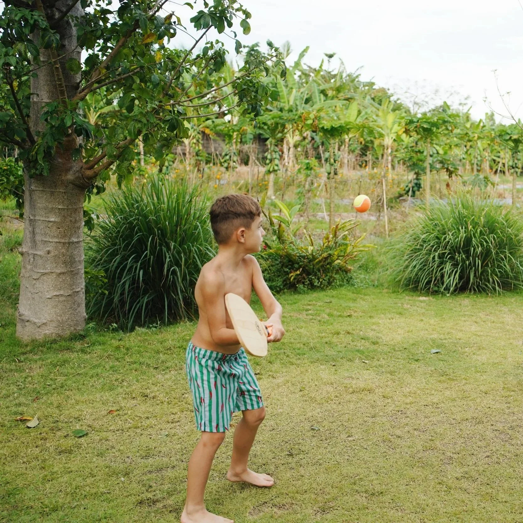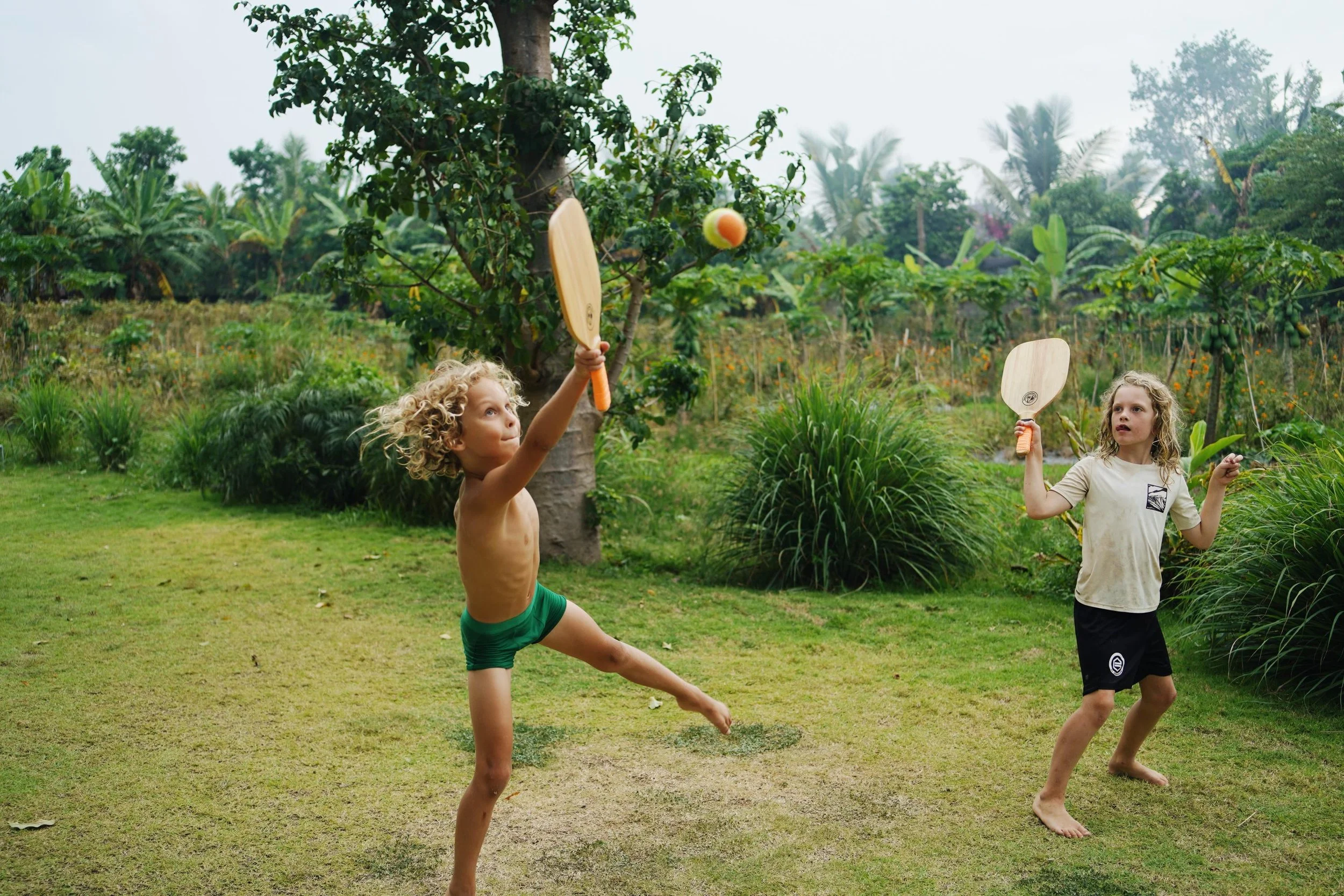 Just grab a wooden racket, a tennis ball, and start rallying on sand, grass,